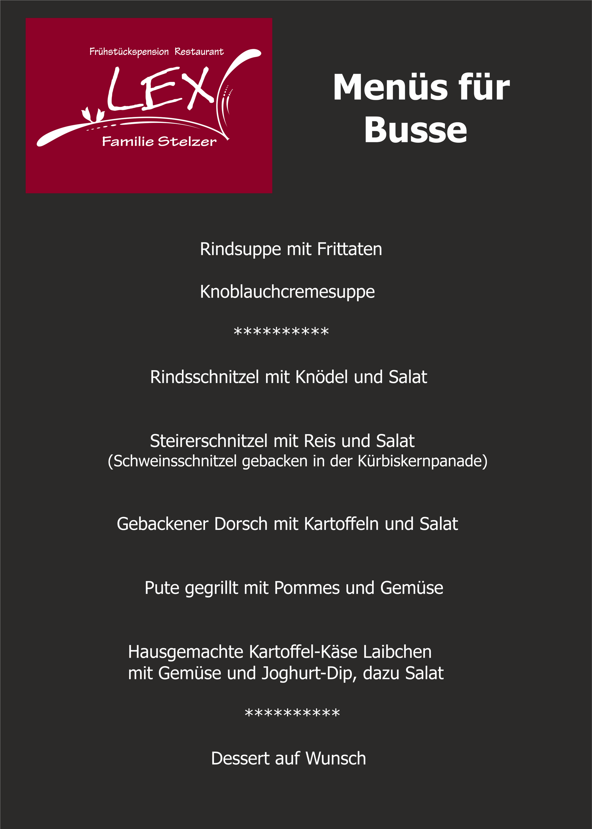 Während einen langen, anstrengenden Tag im Bus kommt eine angenehme Pause mit hausgemachten steirischen Spezialitäten gerade recht. Daher bieten wir speziell für Busse eigene Mittagsmenüs an. Unser Familienbetrieb ist ideal, da im Saal des Restaurants bis zu 70 Personen Platz finden und so bei gemütlicher Atmosphäre während dem Essen auch ein paar Worte ausgetauscht werden können.