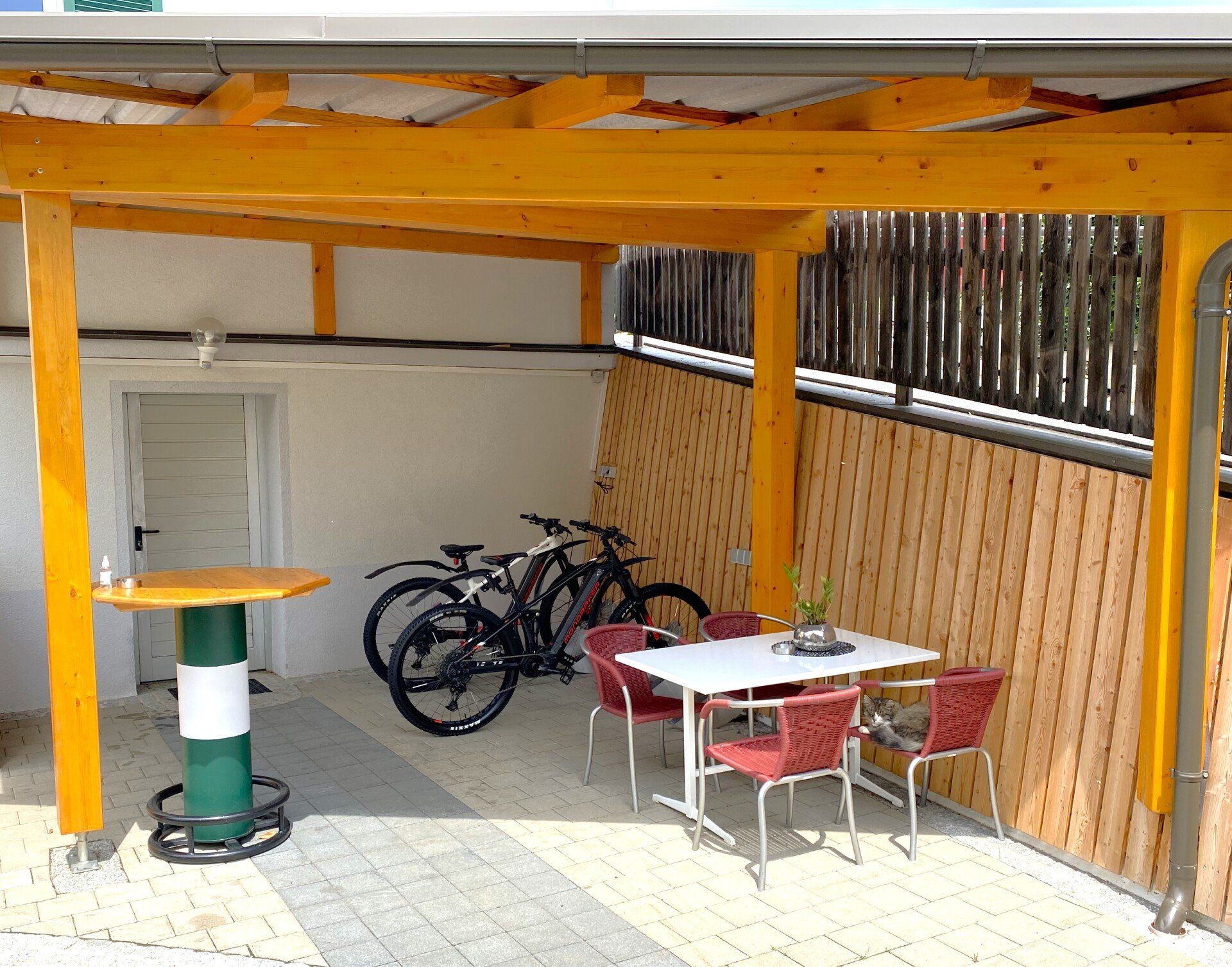 Neben unserer Ladestation für Elektrofahrzeuge, bieten wir zusätzlich noch 6 Übderdachte Parkplätze an, die Sie ohne Aufpreis benutzen können. Auch für Ihre Fahrräder gibt es einen Unterstellplatz, der sogar über Steckdosen verfügt, damit Ihren E-Bikes nicht der Strom ausgeht und Sie schnell Ihr Ziel erreichen.